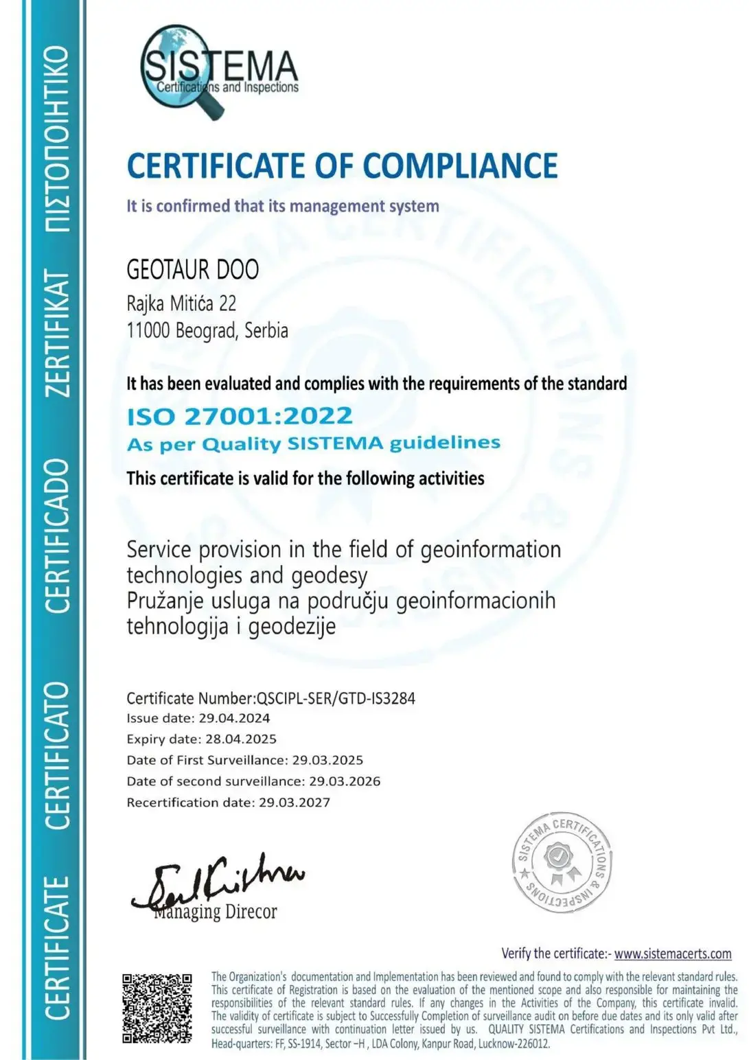 - ISO 9001:2015 – sistem upravljanja kvalitetom